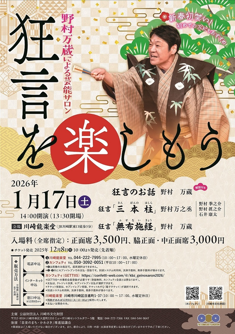 | 2025/10/20 | 先日の「ふらっと狂言会♭6」「万蔵・由祠還暦記念 黒川能出演特別公演」では多くの皆様にご来場いただきましてありがとうございました。今後の公演、12月23日(火)「第五回万蔵の会」(一般発売10月23日~)、2026年1月11日「ファミリー狂言会・冬」「萬狂言冬公演」(一般発売10月29日~)の詳細をアップしました。 |