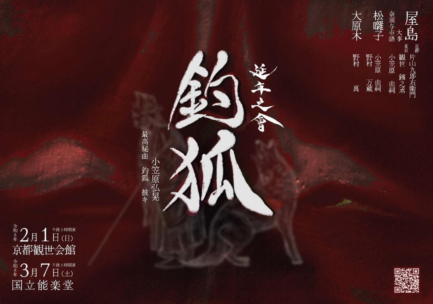 萬狂言関西支部の小笠原由祠と弘晃の親子が主催する延年之會。今回は弘晃が秘曲「釣狐」を披きます。