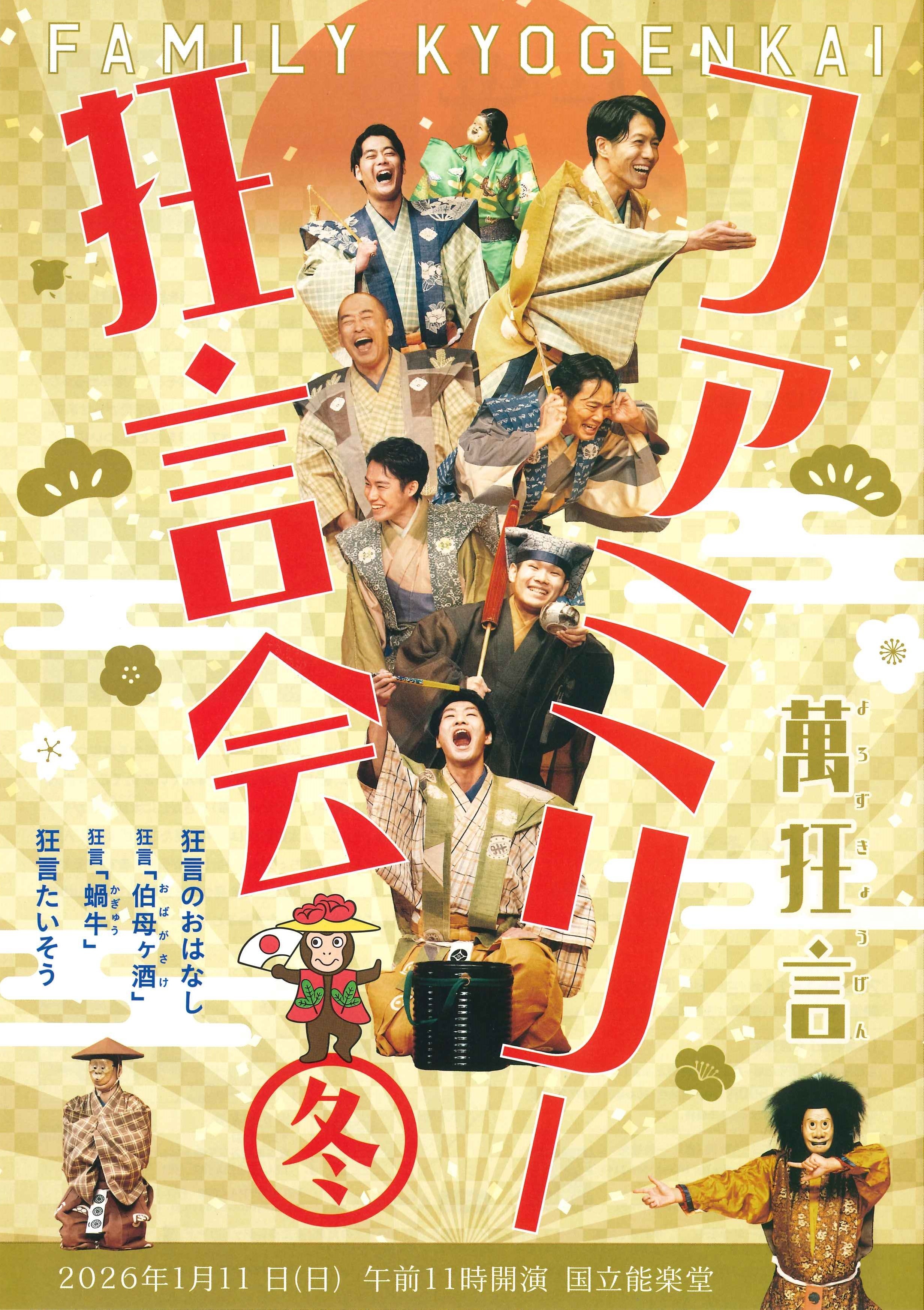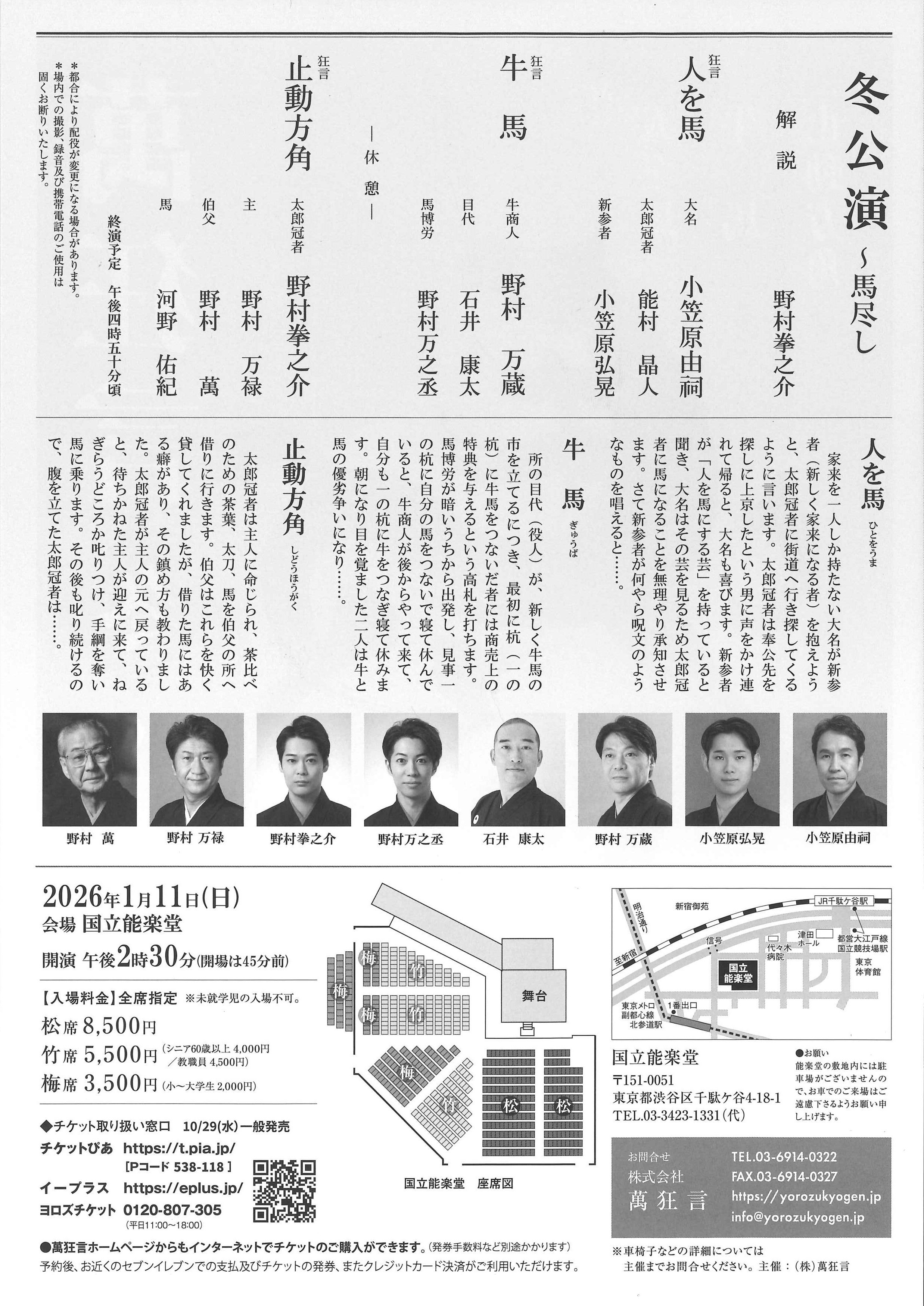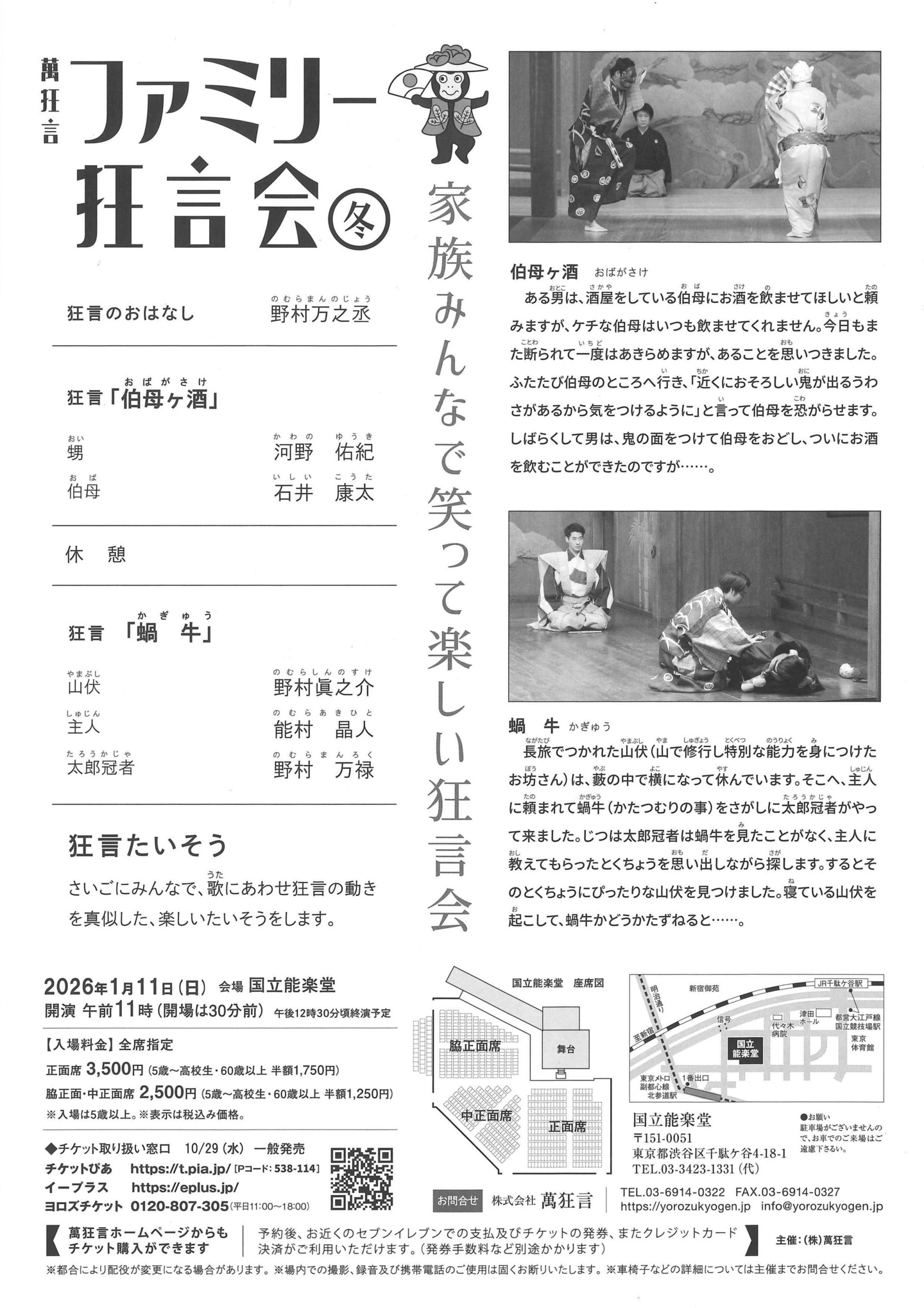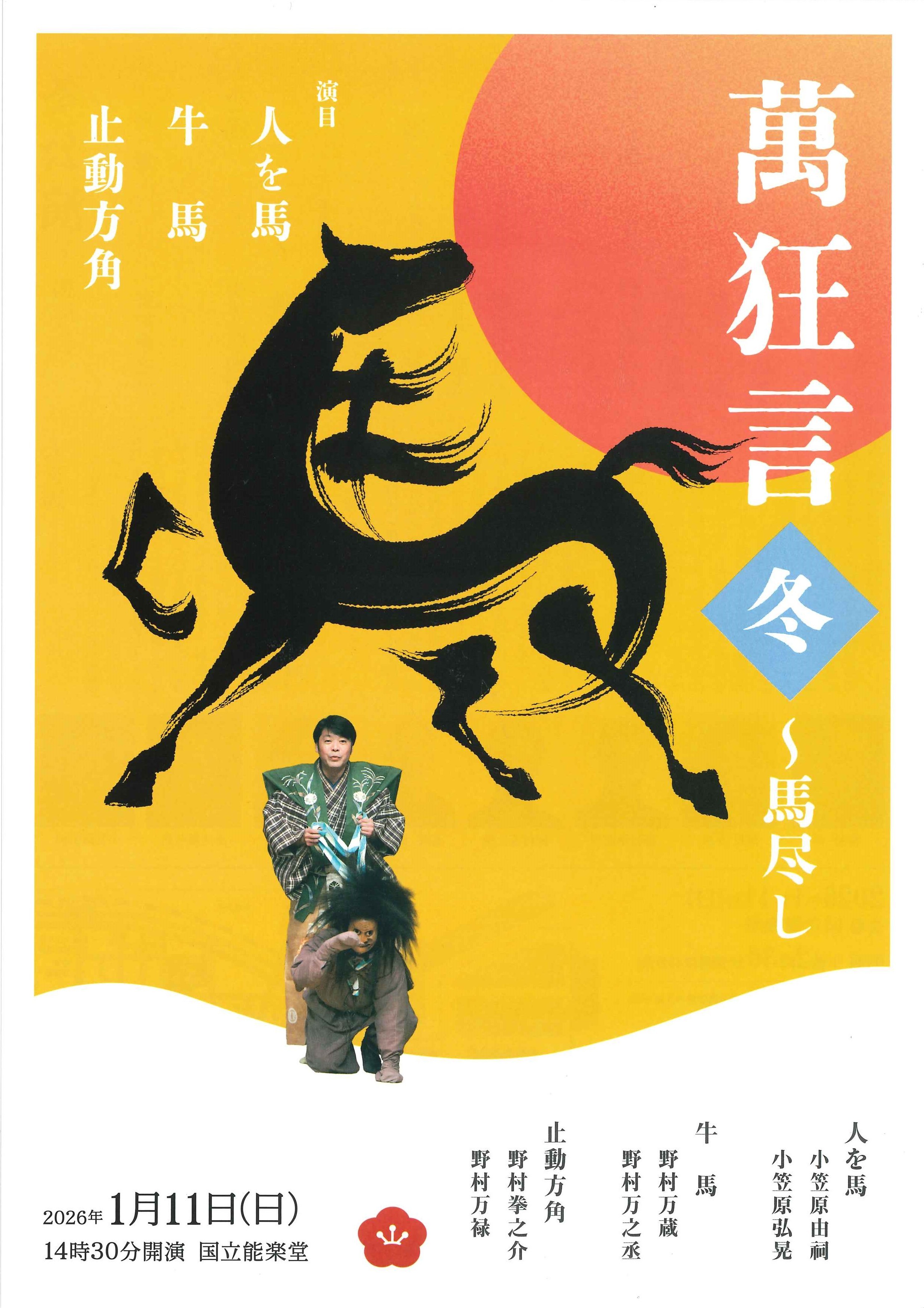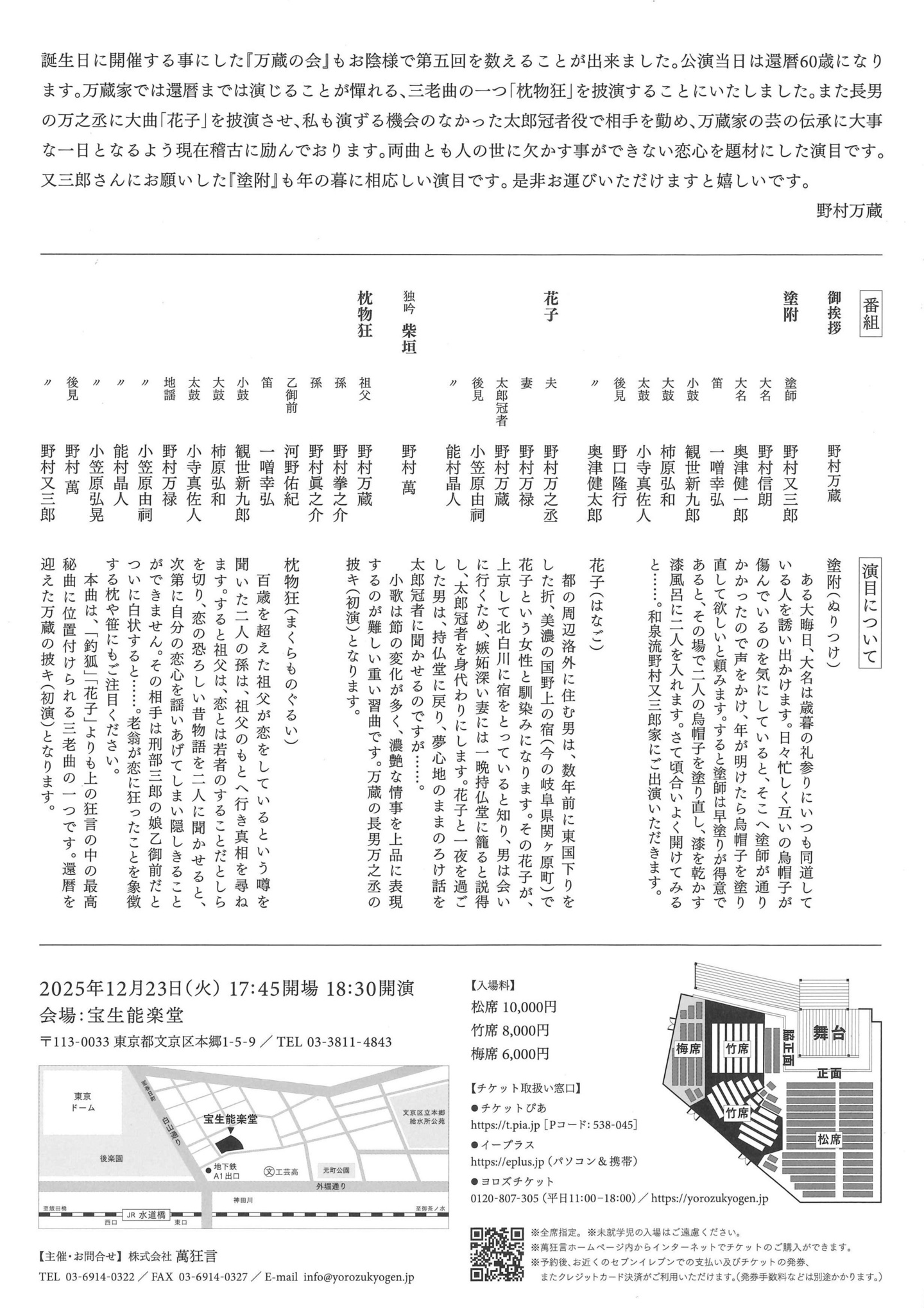 萬狂言 春公演 2025年4月20日(日)14:30開演 国立能楽堂 解説/不見不聞/独吟 七つ子/舟ふな/悪太郎 ※都合により演目変更 ふらっと狂言会♭5 2025年4月20日(日)11:00開演 国立能楽堂 解説/鐘の音/佐渡狐/三兄弟トーク+SPゲスト(中村福之助さん、中村歌之助さん) 萬狂言 大阪公演 2025年6月29日(日)14:30開演 大槻能楽堂 解説/梟山伏/柑子/素囃子 男舞/通円/隠狸 萬狂言 福岡公演 2025年7月5日(土)14:30開演 大濠公園能楽堂 解説/梟山伏/柑子/素囃子 男舞/通円/鈍太郎 萬狂言 夏公演 2025年7月27日(日)14:30開演 国立能楽堂 解説/蚊相撲/重喜/独吟 鎌倉/仁王 萬狂言 ファミリー狂言会・夏 2025年7月27日(日)11:00開演 国立能楽堂 狂言のお話し(特別ゲスト:くまモン)/口真似/首引/狂言たいそう ふらっと狂言会 in富山 2025年8月10日(日)13:00開演 富山能楽堂 解説/柿山伏/隠狸/三兄弟トーク ふらっと狂言会 in金沢ナイトミュージアム2025 2025年8月10日(日)18:30開演 金沢能楽美術館 解説/二人大名/隠狸/三兄弟トーク ふらっと狂言会 in京都 2025年9月20日(土)11:00開演 大江能楽堂 解説/寝音曲/萩大名/三兄弟トーク ふらっと狂言会♭6 2025年10月18日(土)11:00開演 国立能楽堂 解説/仏師/成上り/三兄弟トーク 万蔵・由祠還暦記念 黒川能出演特別公演 2025年10月18日(土)14:30開演 国立能楽堂 ご挨拶/三番叟(黒川能)/松楪/連吟 猿歌 替/針立雷(黒川能)/素囃子 神舞/髭櫓 萬狂言 金沢公演 炭哲男古稀・野村万蔵還暦祝 2025年11月23日(日)14:30開演 石川県立能楽堂 ご挨拶/小舞 花の袖・梅の舞・御田/鍋八撥/狐塚/止動方角 第五回万蔵の会 還暦祝 2025年12月23日(火)18:30開演 宝生能楽堂 ご挨拶/塗附(野村又三郎家)/花子/独吟 柴垣/枕物狂 ファミリー狂言会・冬 2026年1月11日(日)11:00開演 国立能楽堂 狂言のおはなし/伯母ヶ酒/蝸牛/狂言たいそう 萬狂言 冬公演 2026年1月11日(日)14:30開演 国立能楽堂 解説/人を馬/牛馬/止動方角
